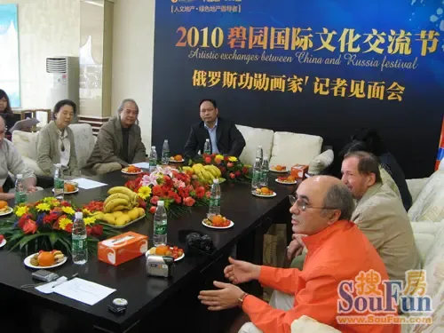 俄罗斯功勋画家和中国翻译老师 俄罗斯画家们与广西美术协会代表等艺术家们在销售中心进行交流,就俄中美术的溯源、绘画形式和发展现状提出各自的学术见解,就两国地域条件对绘画思维和方式的影响而热烈畅谈。俄罗斯画家对广西亚热带风情表现出浓厚兴趣,更倾心于南宁的“绿”、居住环境的“美”,并与广西艺术家们探讨艺术与人居和谐相融的美好生活追求。